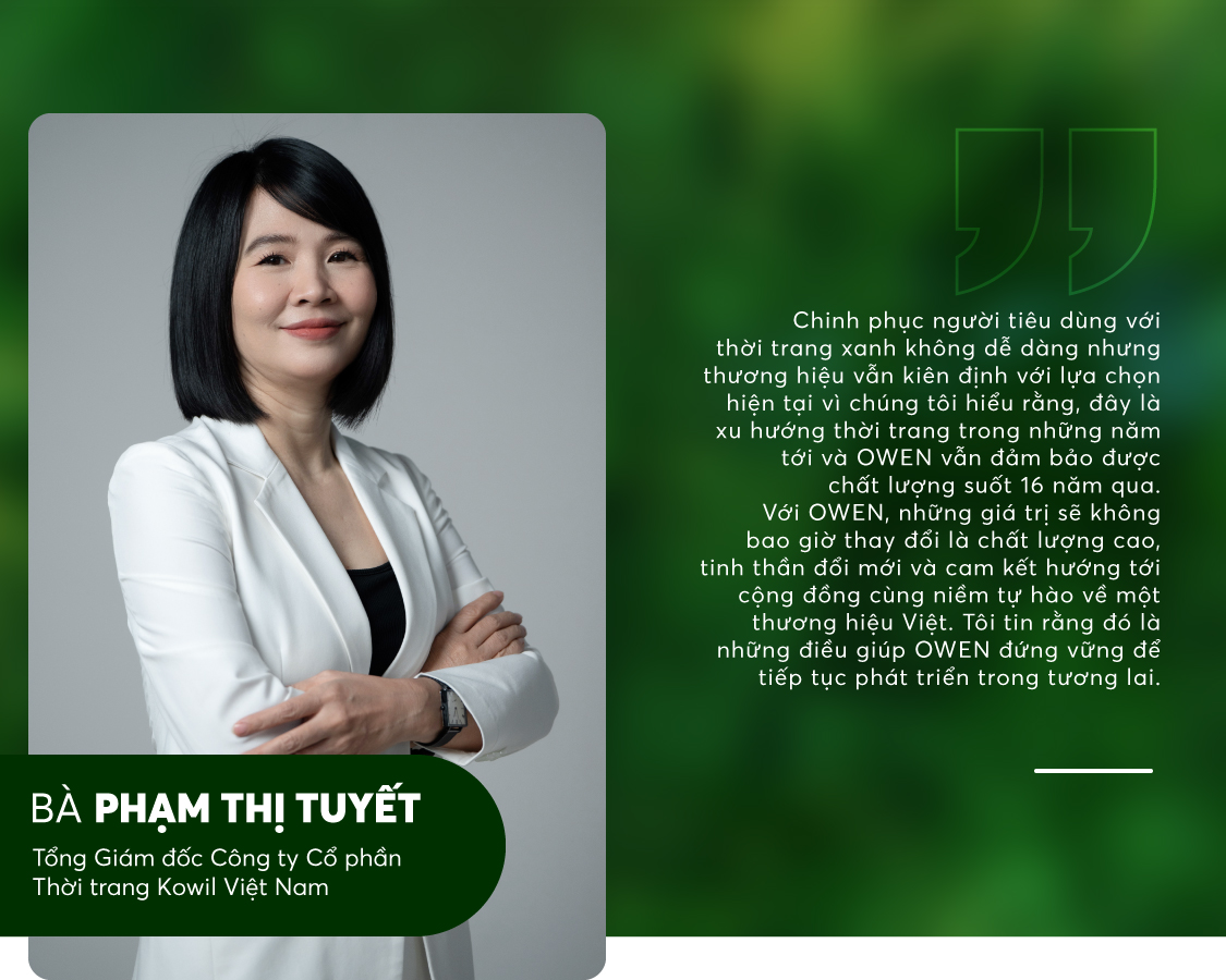“Chinh phục người tiêu dùng với thời trang xanh không dễ dàng nhưng OWEN vẫn kiên định với lựa chọn hiện tại vì chúng tôi hiểu rằng, đây là xu hướng thời trang trong những năm tới và OWEN vẫn đảm bảo được chất lượng thời trang qua 16 năm. Chúng tôi tự hào vì đã phủ sóng khắp thị trường Việt Nam và mỗi năm bán ra được trên 6 triệu sản phẩm”, bà Phạm Thị Tuyết nói.